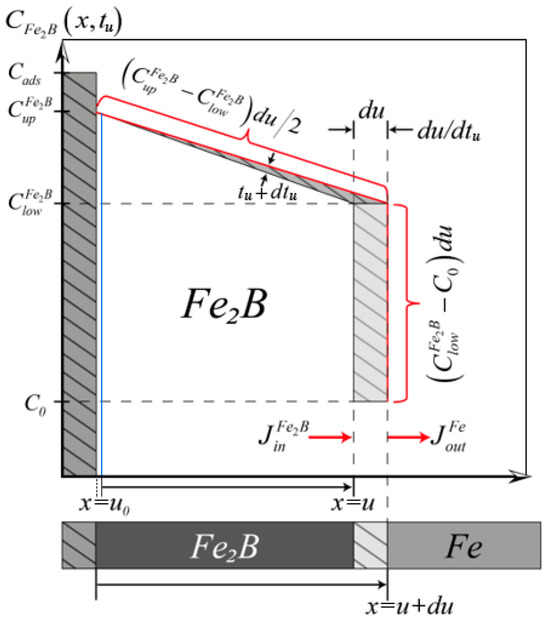 The boron concentrations in Figure 8 (, , and ) remain consistent and are determined by the phase diagram, as depicted in Figure 1. Under these specific conditions, the conservation of mass equation can be derived at the interface separating the Fe2B phase and the substrate. Notably, the forward velocity of the interface between the Fe2B/substrate phases is directly proportional to the difference between the inflow and outflow rates (as demonstrated in Figure 8).