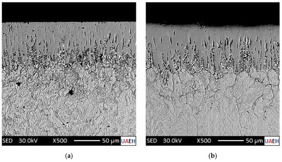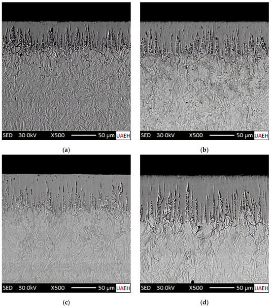 The images presented in Figure 9 illustrate the vertical sections of boronized samples obtained through the implementation of scanning electron microscopy (SEM). These visual representations unveil an internal structure characterized by two distinct regions: a surface boronize coating and an underlying matrix region. Upon thoroughly examining the formation of boronize coatings in all samples, it was observed that the coatings exhibited continuous coverage on the material surface with consistent and uniform thickness. Figure 9 depicts the single-phase sawtooth morphology (Fe2B) of boronized coatings. Within the tetragonal lattice of Fe2B, the highest atomic density of boron aligns along the crystallographic direction [001], which is perpendicular to the sample surface. This orientation facilitates boron diffusion within the lattice, establishing it as the favored growth direction for Fe2B crystals. Consequently, the crystals manifest a sawtooth morphology, notably prominent in iron boronize coatings. The development of this morphology is contingent upon various factors, including the presence of alloying elements in the base material, their respective concentrations, process temperature, and duration. Typically, boronized coatings formed during the boronizing processes of unalloyed and low-alloy steels exhibit a sawtooth morphology. This particular structural configuration significantly enhances the interconnection and adhesion between the substrate material and the boronized coating. Upon careful examination of the microstructure photographs of all samples in this study and considering the circumstances, it can be deduced that the boronize coatings are exclusively composed of the Fe2B phase. The XRD analysis presented in Section 4.2 further substantiates this deduction. The determination of the average thickness of boronized coatings on boronized samples involved the use of optical microscope software (Image-Pro Plus 6.3). To ensure precise data in assessing the boronize coating’s thickness, it is vital to conduct a comprehensive examination encompassing a significant number of measurements from various segments of the coating.