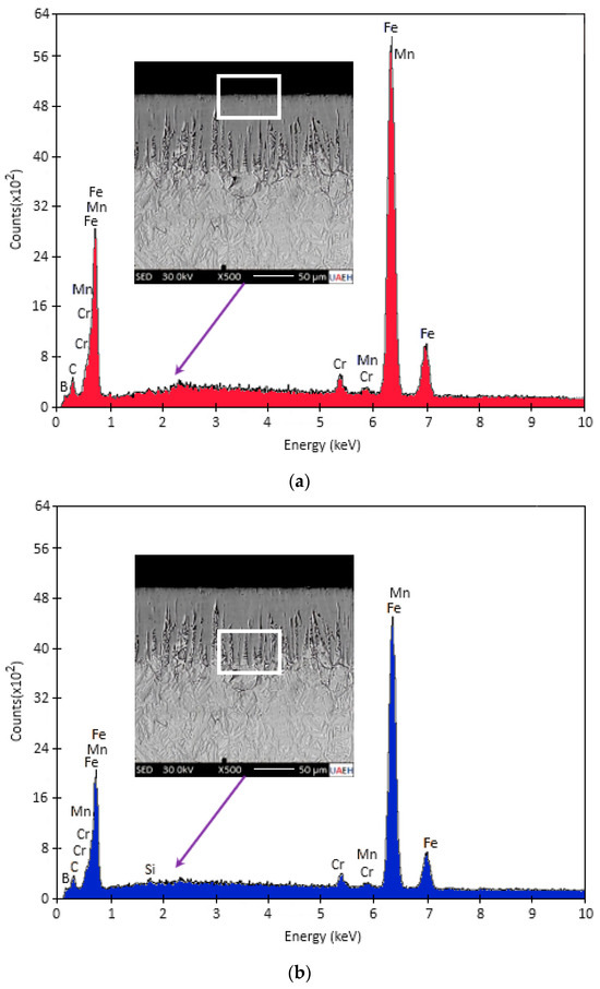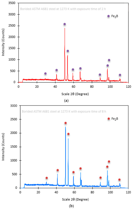 X-ray diffraction analysis was performed on boronized samples to determine the phase or phases forming the boronize coating. Whether the boronize coating has a single-phase or multi-phase structure can affect the tribological, mechanical, and adhesion properties of the boronized material. The XRD patterns obtained from the analysis of two samples boronized at a temperature of 1273 K for two distinct time durations of 2 h and 8 h are depicted in Figure 11. Based on the analysis results, it was determined that the boronize coating had a single-phase (Fe2B) structure. XRD analysis of the relevant samples used a broader range of diffraction angles. The XRD analysis data confirm the idea of a single-phase coating structure formation, as expressed in the microstructural examination results in Section 4.2. The vertical cross-sectional SEM image of the boronized sample and EDS analysis results performed in different regions are shown in Figure 10. The EDS analyses aimed to determine the possible presence of elements such as Fe and B in the boronize coating and their concentrations. Elemental analysis was performed on a total of two regions. Upon evaluation of the results obtained from regions 1 and 2 of the sample (at 1273 K for 8 h), the presence of the B element was determined. It is well established that the boronize coating formed through boronizing unalloyed or low-alloyed iron-based materials may contain a Fe2B or Fe2B+FeB phase. The Fe-B phase diagram shows that the Fe2B and FeB phases consist of approximately 9 wt% and 16.4 wt% B, respectively. The amount of element B in the boronize coatings was determined to be at least 6.03% and 8.15% by weight. Comparing these values with the theoretical weight per cent of element B in the Fe2B phase, it is clear that they are relatively close. It should be noted that the EDS method may not accurately detect elements with low atomic numbers, particularly those below eight. As a result, it was concluded that the Fe2B coating was formed on the surface of ASTM A681 steel by boronizing processes since the determined values were below the amount of boron in the FeB structure and closer to the amount of boron in the Fe2B structure.