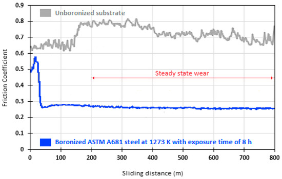 Coefficient of friction as a function of sliding distance L in wear tests of ASTM A681 steel: in the initial condition (unboronized) and after 8 h of treatment at the temperature of 1273 K (boronized).