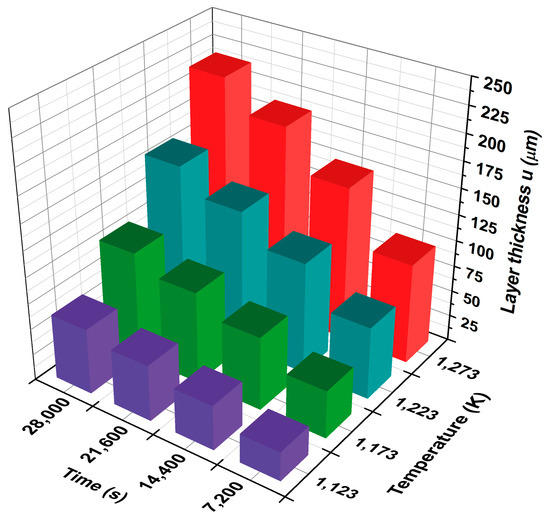 Figure 14 shows the relationship between the thickness of the iron boronize (u) Fe2B coatings with treatment time and temperature. The boronize coating thickness increases with treatment time and temperature [32].