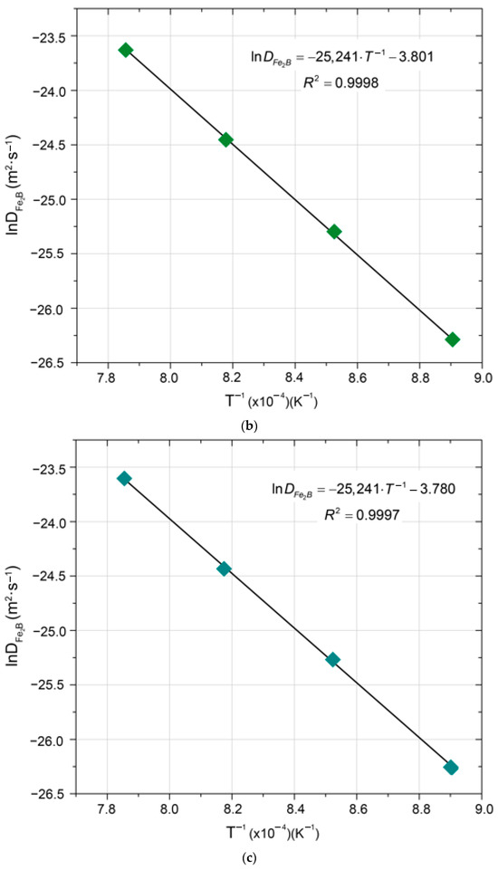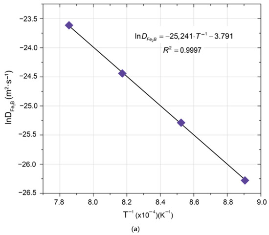 Five distinct models were utilized to evaluate the diffusion coefficients of boron in the Fe2B phase, with a maximal boron concentration of 9 wt.%. The results were fitted with the Arrhenius relation [32], as depicted in Figure 15.