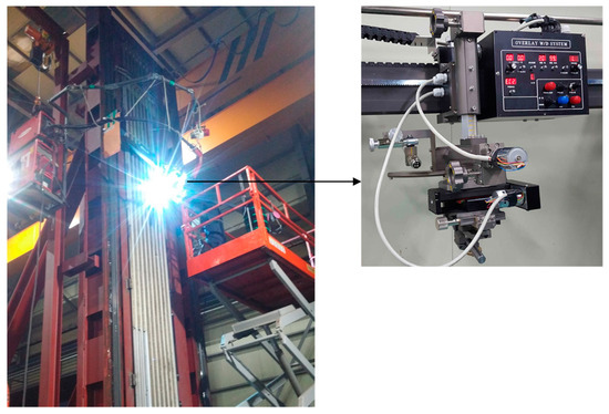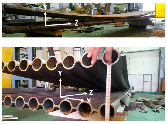 The overlay welding process for water wall panels is conducted from the top to the bottom using automated welding equipment after the structure has been erected vertically, as shown in Figure 2. In Figure 2, the operator is tasked with inspecting the weld to ascertain the quality of the overlay weld. Welding deformation occurs due to temperature gradients and constraints after pipe panel overlay welding. Figure 3 shows an example of a pipe panel that has become deformed after overlay welding.