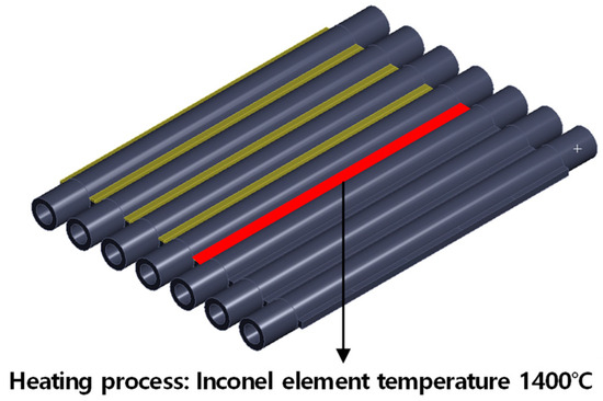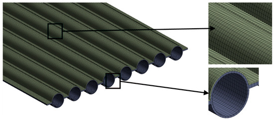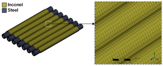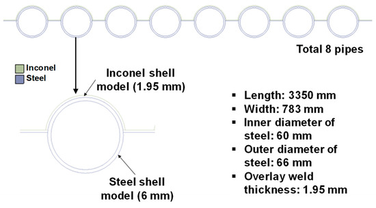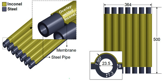 A three-dimensional numerical model was constructed for the thermal elasto-plastic analysis of overlay welding using ANSYS Mechanical 19 (finite element analysis software). The finite element analysis model of the pipe panel for thermal elasto-plastic overlay welding consists of seven pipes. The membrane connects the pipes together. As shown in Figure 4, the analytical model consists of steel pipes, a steel membrane, and Inconel material to be overlay-welded. In this study, the grades of the materials used are SS 400 and Inconel 718, respectively. The size of the analytical model is 364 mm in width and 500 mm in height. The internal diameter of the steel pipe is 23.5 mm, while its external diameter is 30.8 mm. The Inconel material is overlay-welded to a thickness of 1.95 mm, and the membrane is 9 mm thick.