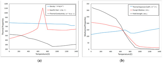 Temperature-dependent material properties of SS400: (a) thermal properties; (b) mechanical properties (Adapted from Ref. [43]).