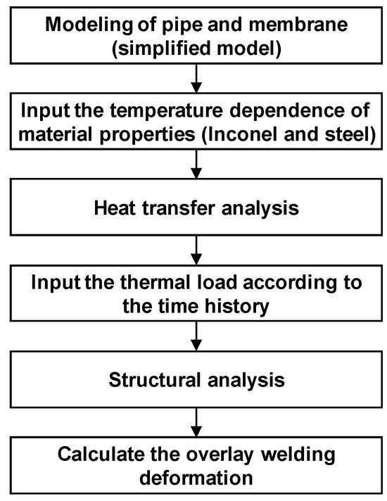 where is the thermal strain, is the thermal expansion coefficient, and is the temperature difference. The reference temperature is assumed to be 22 °C. Thermal strain depends on the thermal expansion coefficient and temperature gradient. The temperature history significantly affects the value and distribution of residual stress. Figure 7 shows a flow chart for the overall overlay weld thermal elasto-plastic analysis.