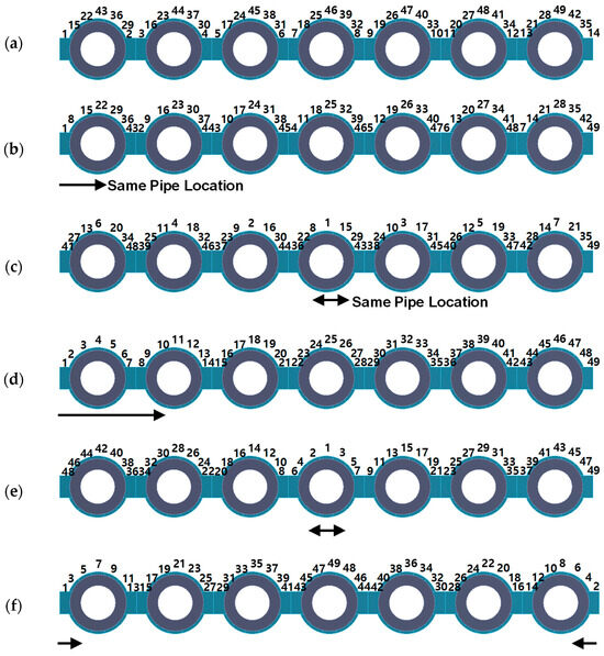 Overlay welding sequence for thermal elasto-plastic analysis; (a) Reference, (b) CASE 1, (c) CASE 2, (d) CASE 3, (e) CASE 4, (f) CASE 5. (The arrows indicate the welding direction up to the first two pipes.)