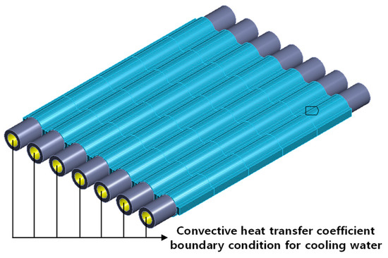 Additionally, during overlay welding, cooling water flows inside the pipe panel, which is considered convective heat transfer. The convective heat transfer coefficient, as illustrated in Figure 11, represents the heat transfer effect by cooling water. The convective heat transfer coefficient for the coolant flowing inside the pipe can be calculated using the internal forced convection equation in Equation (2). In Equation (2), K represents the thermal conductivity of water, while D denotes the internal diameter of the pipe. In the actual process, the thermal conductivity of water, K, is 0.629 W/m·K, given that the temperature of the internal cooling water is approximately 40 °C. As illustrated in Figure 4, the internal diameter of the pipe is 23.5 mm. Consequently, the value of the convective heat transfer coefficient by the coolant inside the pipe is calculated to be 116.7 W/m2·K.