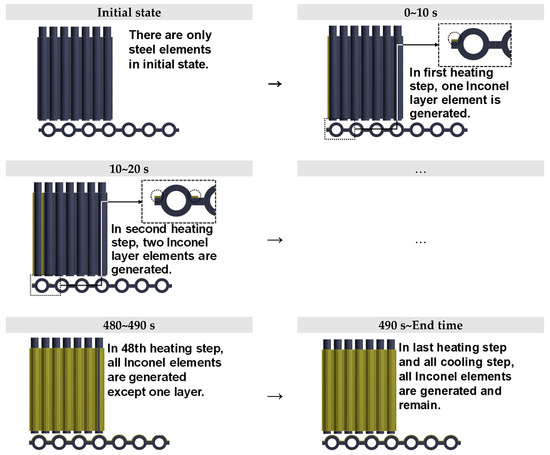 During overlay welding, the temperature of the welding part rises to about 1400 °C, so the temperature of the welding part is assumed to be 1400 °C. During the heating step, one volume segment of the pipe is heated to 1400 °C along its entire length in the z-direction simultaneously for 10 s (Figure 12). The total heating time is 490 s (49 welding lines in total), and the cooling time at room temperature is 3600 s (1 h).