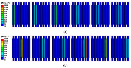 Temperature distribution of the pipes according to the reference welding sequence shown in Figure 10a: (a) from step 3 to step 8, (b) from step 9 to step 14.