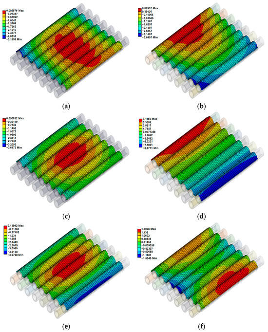 Figure 16 shows the y-direction (out-of-plane) deformation results of the thermal elasto-plastic analysis of the overlay welding on the water wall panel of the SRF boiler. To compare the welding deformation of the Reference case and the other cases proposed in this study, both the maximum y-direction deformation and the total y-direction deviation of all nodes on the overlay-welded surface were considered, as shown in the figures. The results show that the welding deformation is minimized in CASE 5. In CASE 5, the welding is performed alternately from the leftmost and rightmost parts of the structure toward the center pipe, as shown in Figure 10.
