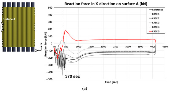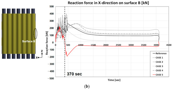 To analyze the cause of the deformation difference due to the welding sequence, the reaction forces at the boundaries (surfaces A and B in the figures) during the welding process were calculated and compared between the Reference case and CASES 1–5. As shown in the graphs in Figure 19, the structure tends to expand during heating, causing compressive forces at the boundaries. However, after 370 s, unlike the other cases, tensile forces are acting on the structure in CASE 5. These tensile forces help minimize the deformation of the structure. In addition, the reason for the minimal welding deformation in CASE 5 is that as welding begins from the parts closest to the fixed ends of the structure, the constraints make deformation less likely. Furthermore, as welding progresses inward, the already-welded outer parts cool and help prevent deformation of the structure.