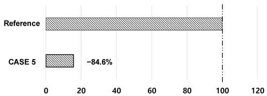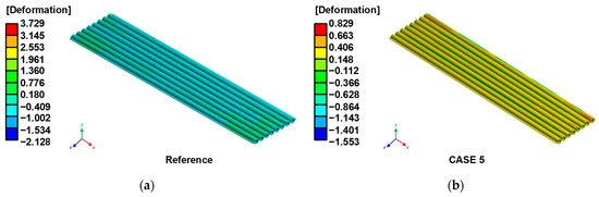 The analysis was performed for the welding sequences of the Reference case and CASE 5. The resulting y-directional displacement field is shown in Figure 22. To compare the overall amount of welding deformation according to the welding sequence, the sum of the deformation deviations was also calculated using Equation (3), as shown in Figure 23. Similar to the results of the reduced model, it can be seen that the deformation deviation of CASE 5 is lower than that of the reference case. In particular, the results of CASE 5 are within 15% (85% welding deformation deviation reduction) of the reference case results, demonstrating the validity of the methodology for full-size overlay-welded structures.