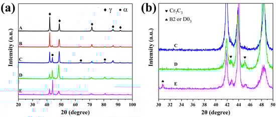 The XRD patterns of six as-cast samples are shown in Figure 1. Sample A without Cr exhibited a fully austenitic single phase. With the increasing of Cr content, the diffraction peaks of the ferritic phase continuously increased in intensity. This indicates that Cr addition enhanced the phase transformation of austenite to ferrite. In particular, at a critical value of 5% Cr content, a marked change in the phase structure was observed. As shown in Figure 1b, there were obvious characteristic diffraction peaks in the Cr7C3 phase in samples D and E, identified as the (202) crystal plane at 42.8° and the (600) crystal plane at 45.1°, respectively. And there was a clear diffraction peak in the B2 or D03 phase on the (200) crystal plane at 30.8° in E. It indicates that when the Cr content exceeded 5 wt%, there was significant promotion of the formation of ferrite, the precipitation of Cr carbides and other ordered structural phases.