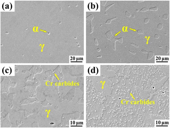 The Fe-20Mn-9Al-1.2C-xCr steels [,] consisted of a dual-phase microstructure of γ-austenite and δ-ferrite. At different Cr contents of 0%, 3%, 6%, and 9%, the volume fractions of δ-ferrite were 3%, 8%, 17%, and 27%, respectively. The addition of Cr altered the morphology of the ferrite phase from short rod-like to block-like. The Fe-12Mn-9Al-1.4C steel [] exhibited a ferrite volume fraction of 9%, with the precipitation of granular κ-carbides at austenite grain boundaries. In contrast, the ferrite volume fraction of the steel with 3 wt% Cr addition increased to 13%, with almost no precipitation at austenite grain boundaries.