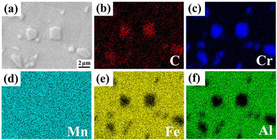The SEM-EDX elemental mappings of sample E are shown in Figure 3, revealing the distribution of elements in the precipitates. It can be seen that the granular precipitates were enriched in Cr and C but depleted in Fe and Al, compared with the matrix ferrite phase, and Mn was distributed homogenously in both phases. It confirms that the precipitates were the Cr carbides, consistent with the phase structure determined by XRD.