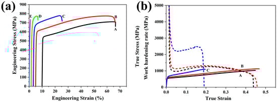 (a) The representative engineering stress–strain curve of all samples at room temperature; (b) The corresponding true stress–strain curves and strain hardening rate curves of samples A, B, and C.
