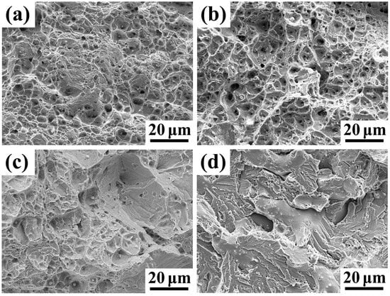 Figure 5 illustrates the tensile fracture morphologies of samples A, B, C, and D. A large number of ductile dimples, ranging in size approximately from 1~3 μm, can be observed on the fracture surface of sample A, showing a typical morphology of ductile fracture. Sample B exhibited a fracture surface with smaller and more uniformly distributed dimples, contributing to its excellent tensile property. From the fracture surface of C, it can be observed that the number of ductile dimples has significantly reduced, and there are distinct features of cleavage fracture. This was a mixed-type fracture. There are many macroscopic features of “small facets” on the cleavage fracture surface, as well as some microscopic morphology of “tongue-like patterns”. The fracture morphology of sample D was characterized by a quasi-cleavage fracture. There are many short and curved tearing edges, and a “river pattern” radiating from the crack source to the surrounding area, along with secondary cracks on the fracture surface.