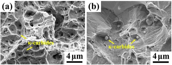 The SEM morphologies of the fracture surfaces in samples A and C are shown in Figure 6. In Figure 6a, it is clearly shown that small κ-carbides existed within the dimples, with sizes ranging from approximately 100 to 500 nm. During stretching, these κ-carbides exhibited weak bonding with the matrix, leading to their rupture at the interface under external forces, then forming micropores. The κ-carbides had an almost one-to-one correspondence with the dimples, indicating that each κ-carbide serves as a nucleation site for a dimple. The morphology of the dimple region in sample C is illustrated in Figure 6b, showing a significantly lower quantity of κ-carbides. The comparison of results proves that the addition of 5% Cr effectively inhibits the nucleation of κ-carbides.