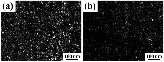 TEM dark-field image of fine κ-carbides in the austenite matrix of the samples in the solid solution state; (a) A(0Cr); (b) C(5Cr).