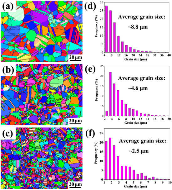 IPF map of the samples after recrystallization and the corresponding distribution of grain size; (a,d) A(0Cr); (b,e) B(2.5Cr); (c,f) C(5Cr).