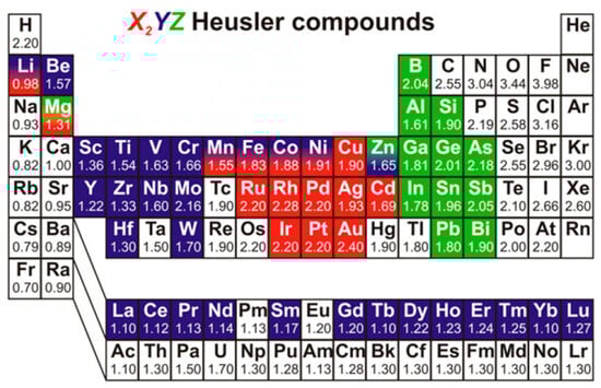 Conventional Heusler alloys are formed by transition metals (d-metals) and the main group (p-group), which is presented by Z atoms (D sites). These alloys typically present the X2YZ composition, where X and Y are transition metals, and Z is a main-group element and often crystallizes in the face-centered cubic (FCC) structure. Moreover, the p-d hybridization present in conventional Heusler alloys significantly affects the parent phase’s stability, atomic ordering and magnetic response []. However, the d-d hybridization influences the martensite transformation, as stated by Roy et al. []. The periodic table of each element that comprises the full-Heusler alloys is illustrated in Figure 1. Regularly, the first chemical element in the formula is the transition metal, whereas the main group atom is placed at the end, such as Co2MnGe and Co2MnSi [,]. Nonetheless, this rule does not apply to compounds like Li2CuSb, where one of the elements is defined as the most electropositive. According to IUPAC criteria, the most electropositive element is the first component in the formula. As aforementioned, full-Heusler alloys display an L21 cubic structure and belong to the Fm-3m space group. However, full-Heusler alloys may demonstrate A2 (X-Y-Z disorder) and B2 (Y-Z disorder) structures, depending on the site-disordered state. Otto Heusler [] originally established the basic structure for Cu2MnAl, and Meyers et al. for Cu2MnSn []. In full-Heusler alloys system, four interpenetrating FCC sublattices constitute the cubic unit cell, where atoms are situated following Wyckoff positions. X atoms are placed at the 8c (1/4, 1/4, 1/4) position of the unit cell, and four Y and Z atoms are placed at the 4a (0, 0, 0) and 4b (1/2, 1/2, 1/2) positions, respectively, as proved by Otto Heusler []. According to Graf et al. [], this structure, which was created by a single X and Z atomm is referred to as a zinc blende sublattice. Furthermore, a Y atom is positioned in the octahedral sites, and the second X atom is in the tetrahedral sites [].