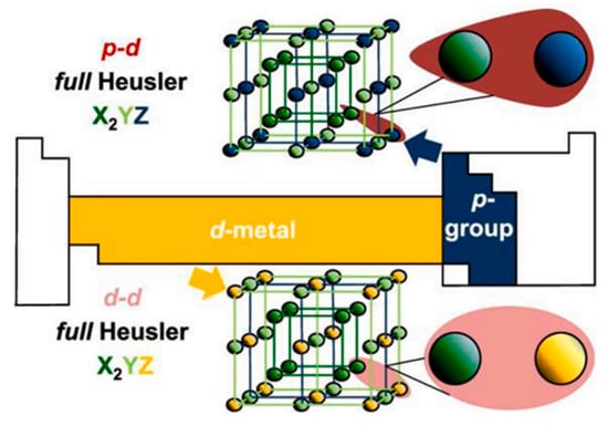 On the other hand, however, all-d-metal Heusler alloys are formed exclusively by transition metals, which means the Z atoms are also a transition metal (D sites) []. The distinguishing feature of all-d-metal Heusler alloys is the absence of main-group elements in their composition. They have a specific composition where all the elements (X, Y and Z) belong to transition metals. These alloys are characterized by having all-d-electron configurations in their constituents. The two types of alloys may present diverse crystal structures as a result of this compositional difference. Accordingly, the crystal structure of all-d-metal Heusler alloys can differ and depends on the specific elements involved. They may favor different structures as non-FCC structures. Otherwise, they might not necessarily follow the cubic symmetry present in conventional Heusler alloys []. The differences in hybridization and chemical elements between conventional and all-d-metal Heusler alloys are shown in Figure 2 [].