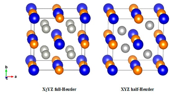 Half-Heusler alloys are presented by the following chemical formula XYZ (1:1:1). These compounds show covalent and ionic parts, where X and Y elements possess cationic character, though Z displays the anionic character. The X element is the most electropositive element, forming a rock-salt (NaCl) sublattice with the main-group atom Z. This interaction corresponds to a stronger ionic character of their bonding []. The Y and Z atoms form a zinc-blend (ZnS) sublattice; this indicates covalent bonding []. Accordingly, the sum of zinc-blend and rock-salt lattice forms the structure of half Heusler alloys []. Figure 3 illustrates the difference between a full- and half-Heusler compound. These alloys crystallize in a C1b cubic structure, belonging to the F43m space group []. Filling the vacancies in the octahedral lattice sites in the tetrahedral ZnS structure yields half-Heusler alloys, which have a non-centrosymmetric arrangement and constitute a ternary ordered modification of the CaF2 structure []. As stated by certain authors, four FCC sublattices might additionally be employed to represent these compounds while one sublattice is empty []. In this situation, X atoms are situated in Wyckoff positions 4c (1/4, 1/4, 1/4), Y atoms are located in the 4b (1/2, 1/2, 1/2) positions and Z atoms occupy the 4a (0, 0, 0) position, respectively. Furthermore, Table 1, expresses that for such a type of structure, three distinct atomic combinations are conceivable [].