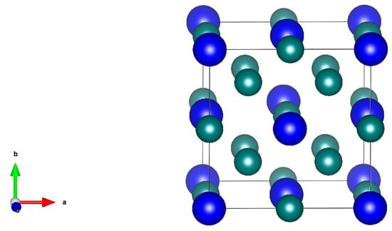 Binary Heusler alloys can display the X3Z (3:1) chemical formula, with X being the transition metals and Z elements of the main group []. These alloys present a face-centered cubic structure D03-type and present the same space group Fm-3m of full Heusler alloys. When the X and Y elements of full-Heusler compounds are the same chemical element, a D03-type structure is formed. Therefore, three X1, X2 and X3 atoms are positioned in the (¼, ¼, ¼), (½, ½, ½) and (¾, ¾, ¾) sites, and Z atoms fill up the (0, 0, 0) positions. This arrangement leads to a ferromagnetic interaction between the two X1, X3 and X2 atoms, as the positions occupied by X1 and X3 are equivalent []. Figure 5 presents the D03-type crystal structure.