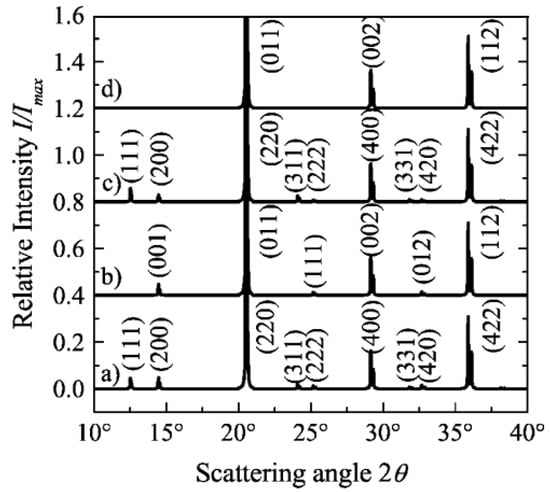 Simulated X-ray diffraction patterns measured with Mo-Kα radiation for Co2MnSi in different crystal structures: (a) Cu2MnAl-type (L21), (b) CsCl-type (B2), (c) BiF3-type (DO3), (d) tungsten-type (A2) (reprinted with the permission from Ref. []).