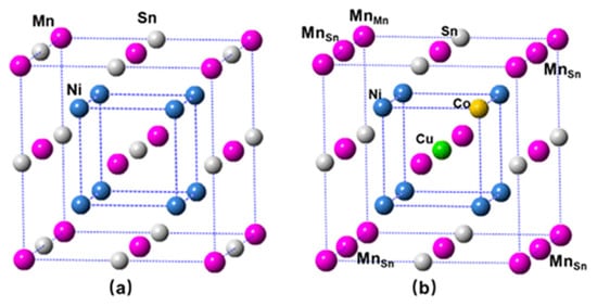 Unit cell of the cubic structure of (a) Ni2MnSn and (b) NiCoMnSnCu alloys (reprinted with the permission from Ref. []).
