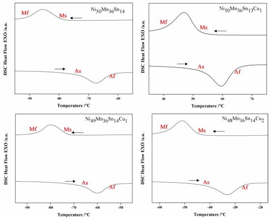 As reported above, thermal hysteresis is a typical characteristic for the martensitic transition because of the first-order nature of the transition. Henceforth, in order to notice the martensite–austenite transition, thermal analysis (DSC scans) must be performed by heating/cooling between room temperature and a temperature higher than the austenite start temperature for alloys that present an austenite phase at room temperature (in XRD spectrums), whereas a cooling/heating rate from room temperature to a temperature lower than the martensitic start temperature for alloys presenting a martensitic phase must be performed [].