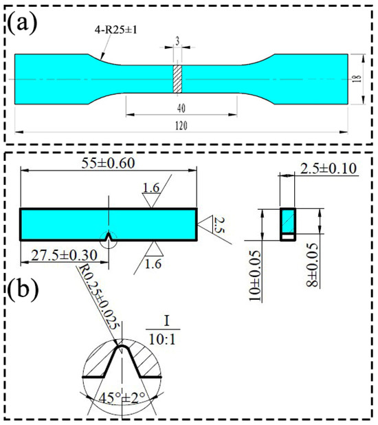 Schematic of tensile and impact specimen: (a) tensile specimen; (b) impact specimen.