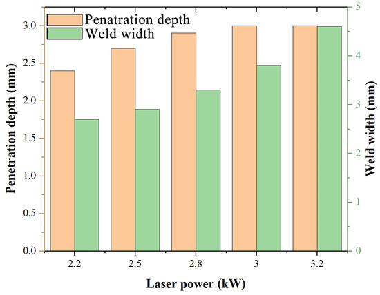 The effects of laser power on the welded seam formation (front and back surface) are shown in Figure 3, and the depth penetration and weld width of welded joints are shown in Figure 4, respectively. When the welding speed remained constant (v = 1.2 m/min), as the laser power (P < 2.8 kW) increased, the penetration depths progressed from incomplete penetration to burning through, resulting in undercut [24], as shown in Figure 3. The increase in welded width of the weld seam followed an approximately linear pattern, as shown in Figure 4. The photoinduced plasma impacted the keyhole, which caused the reaction and the spreading of the metal liquid around the keyhole towards the width of the molten pool [14]. As the laser power was 3.0 kW, the welded seam was vivid and lustrous, and there were no defects, such as spatters on the surface. As the laser power continued to increase, severe spatters occurred on the front, and collapse appeared on the back [25].