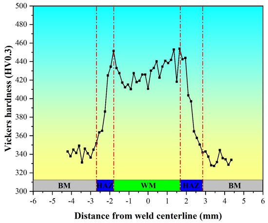- The microhardness of the welded joint was distributed in a hump distribution, gradually increasing from BM to HAZ. The microhardness of the fusion line was the highest at 454 HV. The hardness of the welded metal zone fluctuated between 410 and 450 HV, which was higher than that in the base metal area. The microhardness value of BM was the lowest at about 340 HV because a large number of needle-like α′ martensites, with high dislocation density and twinning, were formed in the welded metal zone.