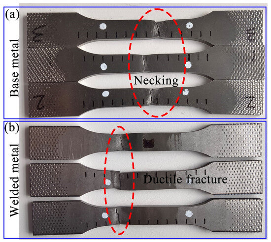Both the base metal and the welded joint specimens underwent surface necking due to the nucleation and growth of micropores under tensile stress [38], followed by the aggregation and growth of micropores, and finally, fracture, with a fracture angle of about 45°, as shown in Figure 12. The tensile specimens are generally fractured in the base material, and this indicates that equal-strength-matched welded joints were obtained.