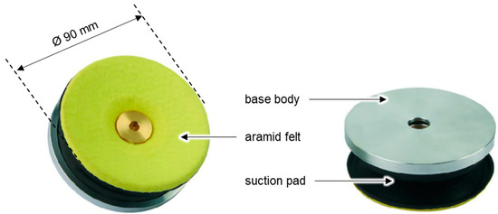 To avoid this risk and to guarantee performance up to 400 °C, a suction pad made of an elastomer with a heat barrier and an aramid felt covering the surface was used (Figure 1). As a result, application temperatures of 400 °C during operation and peaks of up to 500 °C were realised [10]. When vulcanising the elastomer, the back of the suction pad can be connected directly to a metal support body, e.g., aluminium, which is relevant with regard to the development of a contoured mask, as shown later.