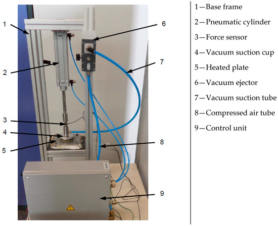 The test rig is set up as shown in Figure 2 to determine the vacuums and the maximum holding forces, taking into account the process-relevant boundary conditions. The test rig essentially consists of the base frame (1), the vacuum ejector (2) with an integrated vacuum sensor, a linear unit (2), the test plate (5) and the force sensor (3). The vacuum ejector provides the required vacuum at the suction pad, and enables a maximum flow rate of 300 L/min and a maximum vacuum of 90%. The linear unit applies the required tear-off force, which is detected by the force sensor. An aluminium die-cast plate and segments from a real die-cast component, which can be heated up to 400 °C using an electric heating element and a mounting with a changeable angle, are used as test plates.