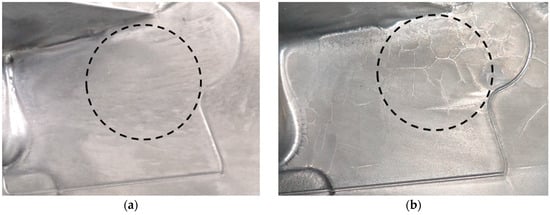 Segments taken of a shock tower out of a mould with different ages and positions of the suction cups indicated by dotted circles: (a) casting from a mould after 19,000 cycles; (b) casting from a mould after 115,000 cycles.