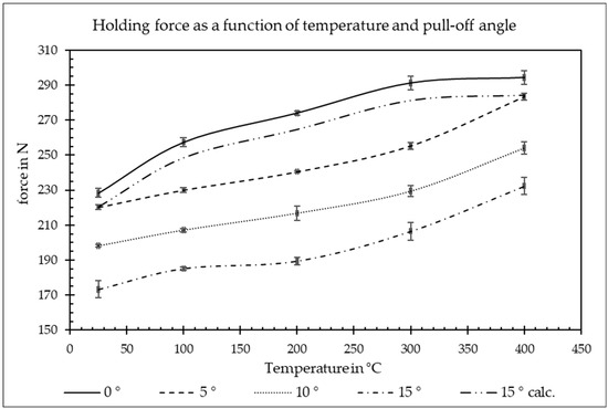 The maximum holding forces can be achieved at a pull-off angle of 0° and decrease as the angle is increased. The results are plausible, as the pull-off force is divided into a normal force to the surface and a shear force when the angle is increased. Assuming that the force is divided into normal and shear force at an angle of 15°, the diagram shows that the difference between the calculated and measured force deviates. This shows that the force distribution of classical mechanics cannot be applied here and that the behaviour is much more complex and must be taken into account in the subsequent design. The behaviour with an increase in temperature is striking. The pull-off force increases with increasing temperature in each series of tests.