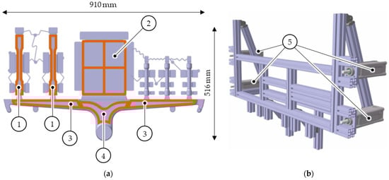 A test mould is available as a die-casting tool, which also has a conventional ejector system as a backup solution. The casting and the sealing surfaces applied to it are shown in Figure 7a. The casting consists of a runner system, which is covered by two segments, (3) and (4); two tensile specimens (1); one casting plate (2); and three fatigue specimens, which are excluded due to their curvature. The contour-adapted vacuum felt suction cups are mounted on a carrying frame, as shown in Figure 7b. The demoulding force is applied via four pneumatic cylinders, which can apply a maximum of 11,222 N at a pressure of 9 bar.