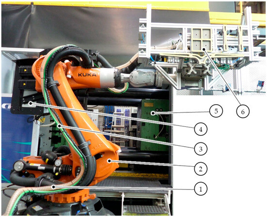 Experimental setup on die-casting machine with removal device (6) on industrial robot and the clamped mould in the background (5).