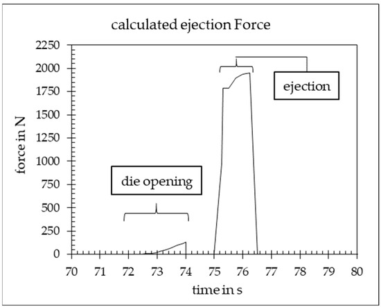 The curve of the calculated demoulding force was plotted over the process time, as shown in Figure 9. Two local maxima occur during the process. The first occurs during the mould-opening process, in which the cover die is removed in the simulation. During the process, the casting undergoes a small reversible deformation, which leads to a small increase in the forces that act on the ejector pin. From 75.0 s, the demoulding process takes place, during which the force rises abruptly to 1782.5 N within 0.3 s. Within this short period of time, the static friction is overcome in most areas of the casting. In the further course of the process, the casting is ejected when the sliding friction is overcome and reaches its maximum force of 1952.2 N.
