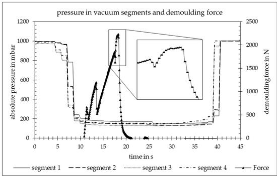 Measured pressure in the grouped vacuum segments and demoulding forces of the experimental investigation in the die-casting process for a representative cycle. The time is from the beginning of the demoulding phase to placement on the sluice. The highlighted area shows the process during the actual demoulding.