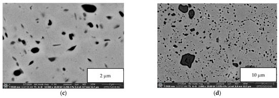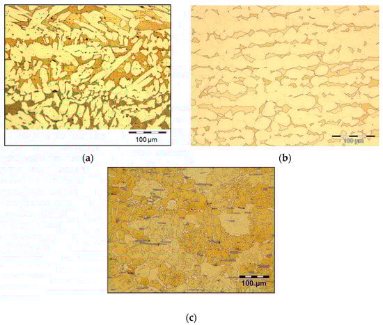 When brass alloys with increased wear resistance are required, normally, special brass alloys such as CuZn37Mn3Al2PbSi (Figure 2c) are chosen [,]. Using the variation in the chemical composition, the resulting zinc equivalent and the temperature treatment of the materials, the brass matrix in such alloys can be adjusted from predominantly α-phase to a mixture of α- and β-phases to pure β-phase. In brass alloys, a higher content of the β-phase already leads to better wear resistance, but the main effect is achieved by the hard phase particles (usually silicides with a length of a few µm to a maximum of several 100 µm) which are distributed homogeneously within the brass matrix to protect the softer brass matrix from wear.