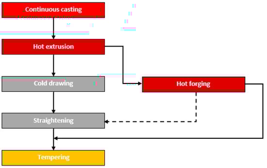Finally, the alloy composition and α/β-phase mixture also have a strong effect on the production process for manufacturing semi-finished parts for sliding applications (Figure 3) []. In the hot extrusion and hot forging processes, a high β content helps reduce hot forming resistance. For cold forming steps such as cold drawing and straightening of bars, tubes or forgings, cold stamping or flanging a higher α-phase content facilitates the forming process.