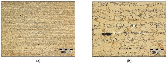 CuZn31Si1 alloys (both lead-alloyed and lead-free, silicon brass) are used as a standard for low- to medium-load-sliding applications (Figure 2b) []. These silicon brasses have a structure consisting predominantly of the α-brass phase with a smaller proportion of the β-brass phase, which is aligned in the direction of hot deformation. Compared with the α-phase, the β-phase contributes more to the wear resistance of this alloy. The silicon in this alloy is kept in a solid solution.