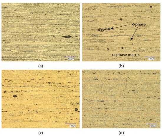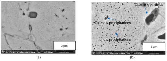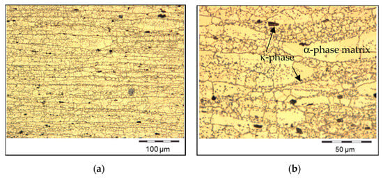 Dynamic recrystallisation during hot extrusion leads to homogenisation and additional refinement of the microstructures from casting []. After hot extrusion, the microstructures consist of an α-phase matrix with κ-phase precipitations, the latter having a size of several microns. The grains are stretched in the extrusion direction, while the grain size in the radial direction is smaller (Figure 6). However, the grain size is also significantly smaller in the transverse direction compared with the cast state. The decrease in grain size compared with the as-cast state is the main reason for the increased strength after hot extrusion (Hall–Petch relationship [,,]). The Hall Petch effect is more pronounced in longitudinal than in transverse direction because of the aspect ratio of the grains.