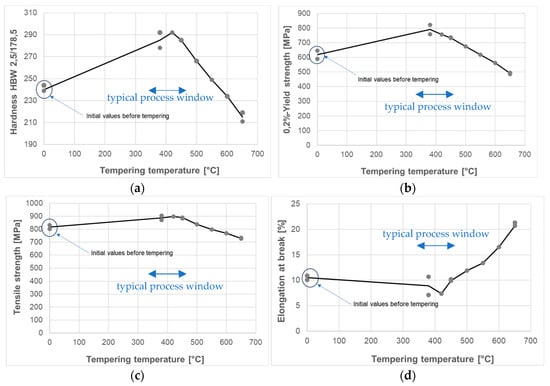 Mechanical properties of CuAl8Fe5Ni4Zn4Sn1 depending on tempering temperature (3 h tempering time): (a) hardness, (b) 0.2%-yield strength, (c) tensile strength and (d) elongation at break. The material was previously hot extruded, cold drawn and straightened.