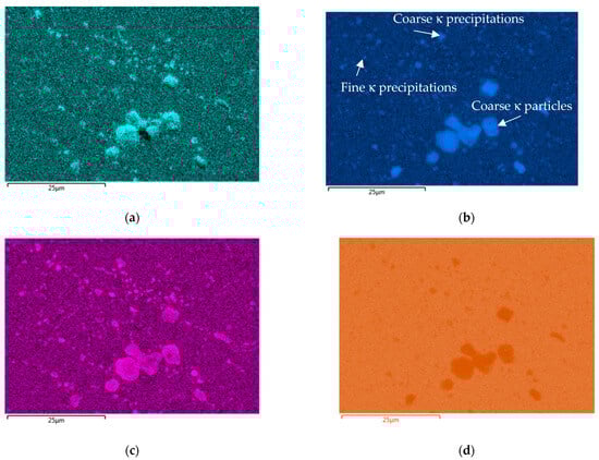 Both coarse and fine precipitations (κ-phases) can be seen and were analysed using EDX mapping (Figure 11) and point analysis. As shown in Table 3, coarse particles are of the Fe3Al-type, but because of their size of several microns, they have only little relevance for the strengthening of the material. The size of the fine particles ranges from about 20 to 100 nm, and they are of the Fe3Al-, NiAl- and Al3Ni5-types. This means that these fine precipitates are just the right size for effective precipitate hardening, and these results demonstrate that fine κ-phase precipitations are the reason for such strong age hardening in the new alloy.